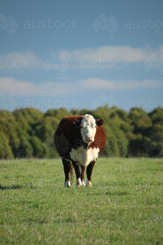 Keywords: farm, paddock, animal, farming, rural, agriculture, nature, landscape, remote, Australia, outdoor, standing, scenic, pasture, grazing, cow, meat industry, countryside, regional, green grass, farmland, free-range, country living, ranch, beef, farm life, sunlit, bovine, domestic animals, ear tag, agribusiness, grass-fed