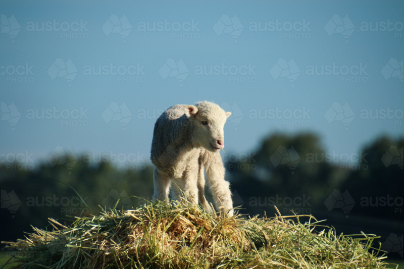Lone lamb standing atop a mound of hay - Australian Stock Image
