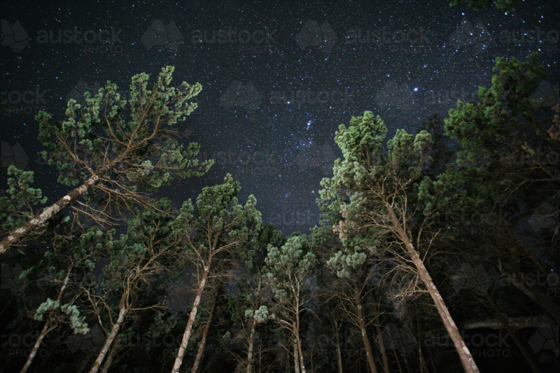 Looking up at starry night sky with trees in foreground - Australian Stock Image