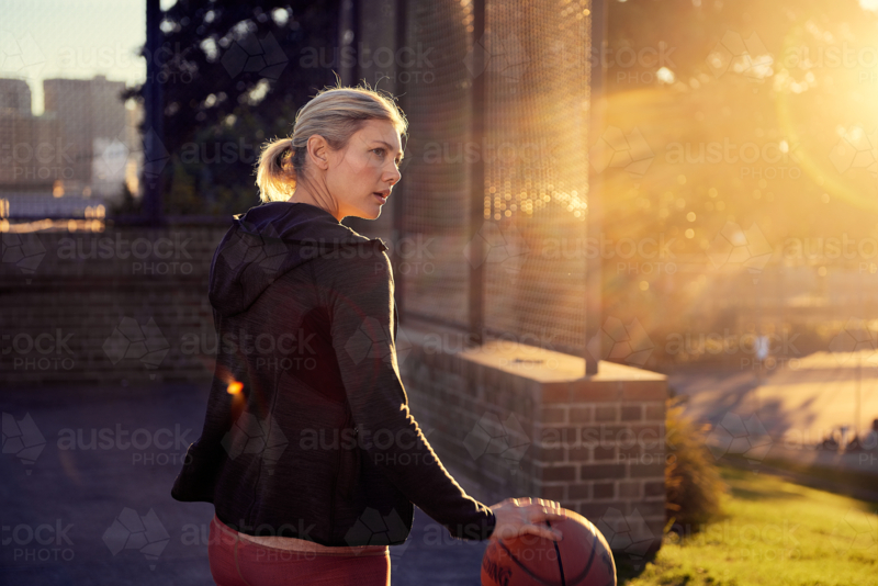 Woman with basketball in sunlight - Australian Stock Image
